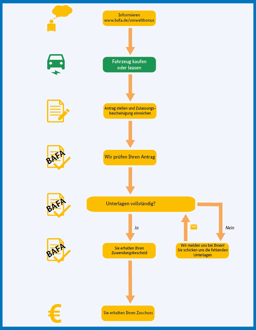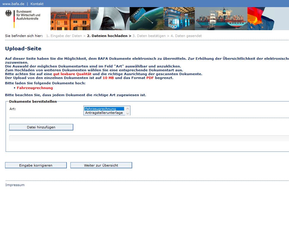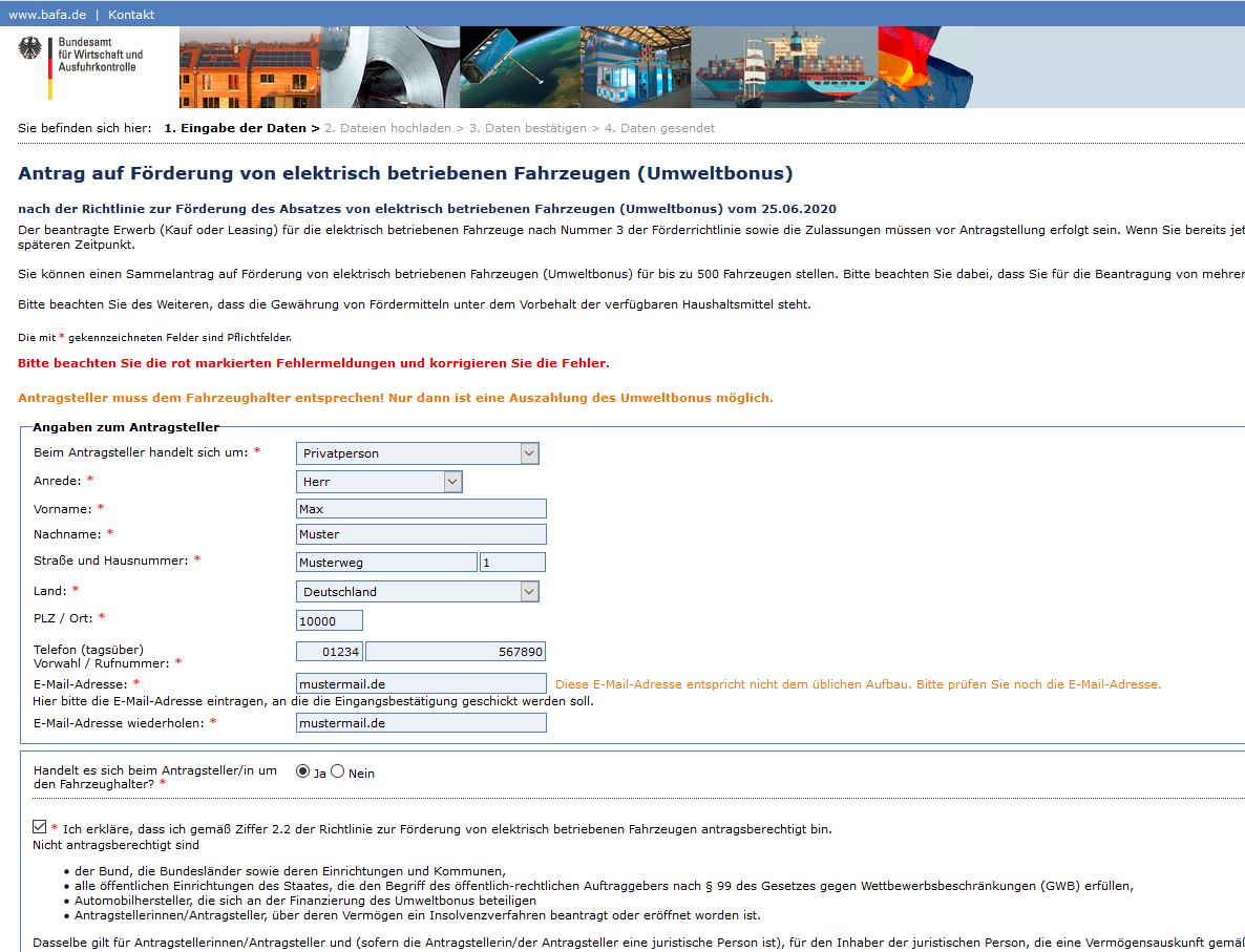 Zuerst werden Ihre persönlichen Daten abgefragt. Nachdem Sie Ihre personenbezogenen Daten eingegeben haben, können Sie auswählen ob es sich um ein privates oder ein gewerbliches Leasingangebot oder um einen Kaufvertrag handelt. Im nächsten Schritt wählen Sie Marke und Modell des zu fördernden Fahrzeuges. Die Dropdownliste umfasst alle förderfähigen Fahrzeuge. Sollten Sie Ihren Pkw in der Liste nicht finden, so ist dieser aktuell nicht förderfähig. Beachten Sie aber, dass die Liste des BAFA ständig aktualisiert wird. Es lohnt sich also unter Umständen, zu einem späteren Zeitpunkt nochmals nachzuschauen. Ist Ihr Auto in der Liste, müssen Sie nun Angaben zur Bestellung machen. Bestelldatum und Art der Zulassung werden an dieser Stelle abgefragt. Nachdem Sie alle Daten ausgefüllt haben, werden Sie dazu aufgefordert, Ihren Kauf-/Leasingvertrag hochzuladen und an das BAFA zu übertragen. Machen Sie falsche Eingaben, (etwa eine fehlerhafte FIN oder eine fehlerhafte IBAN,) weist Sie das Antragsformular automatisch darauf hin und bittet Sie um Korrektur.