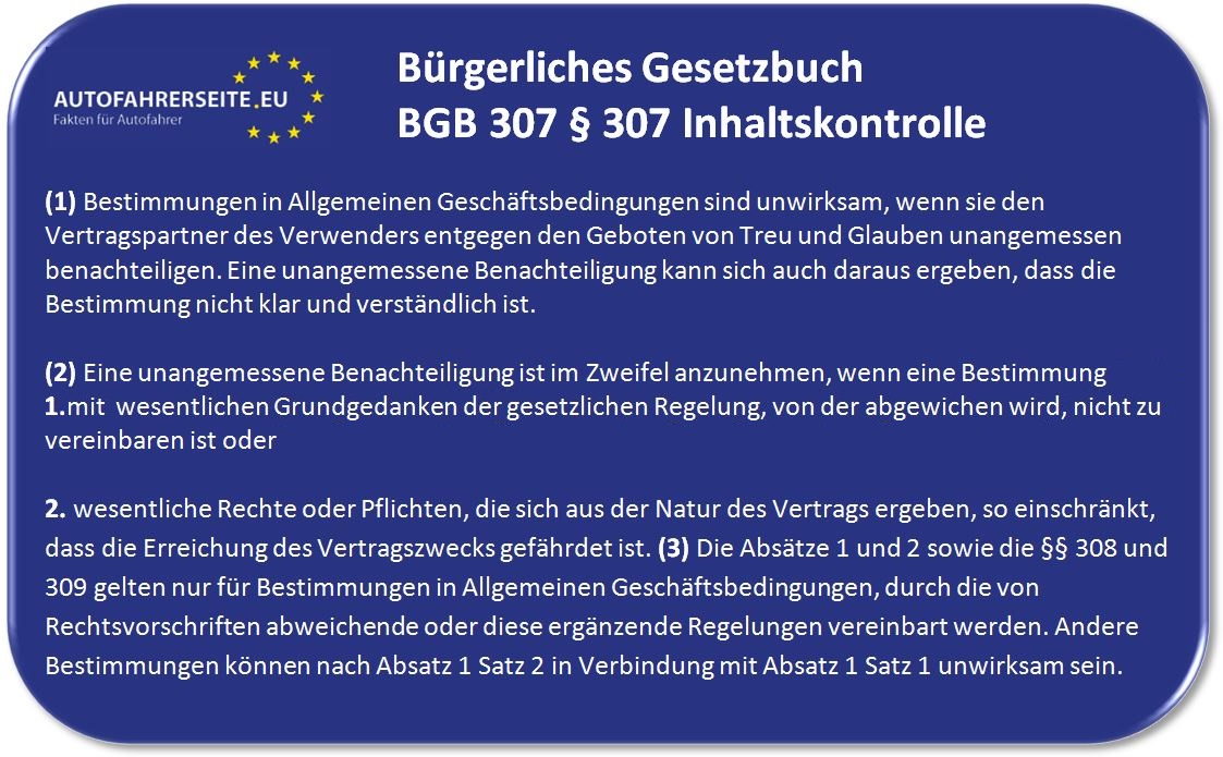 Das Gericht hält die Klausel jedoch für unwirksam, weil sie den Garantienehmer unangemessen benachteiligt (siehe auch § 307 Abs. 1 Satz 1 BGB / siehe Abb.). Auch die Erklärung des Garantiegebers, er habe ein Interesse daran, dass die Arbeiten in einer seiner Vertragswerkstätten durchführt werden, da er ja schließlich weiter Garantiegeber sei, änderten nichts an der Meinung des Gerichts. Zudem wäre es auch Fakt, dass der Garantienehmer im Fall einer fehlerhaften Reparatur Gewährleistungsansprüche gegen die reparierende Werkstatt habe.