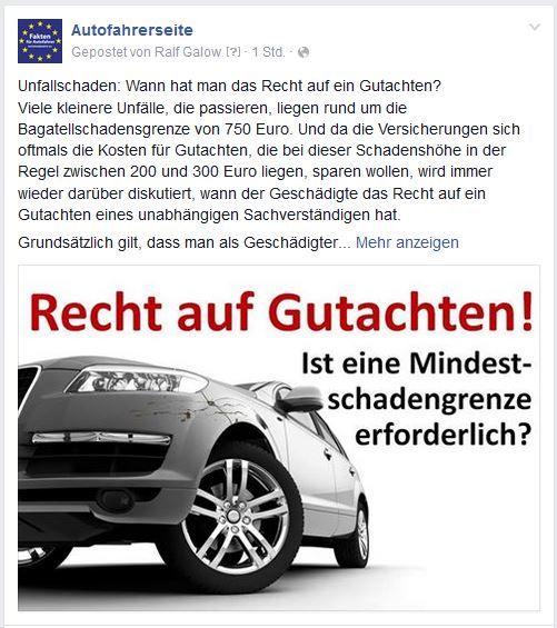 Viele kleinere Unfälle liegen rund um die Bagatellschadengrenze von 750 Euro. Für Fälle wie diese möchten sich die Versicherungen oftmals die Kosten für Gutachten, die bei dieser Schadenhöhe in der Regel zwischen 200 und 300 Euro liegen, sparen. Daher wird immer wieder darüber diskutiert, wann der Geschädigte das Recht auf ein Gutachten eines unabhängigen Sachverständigen hat.