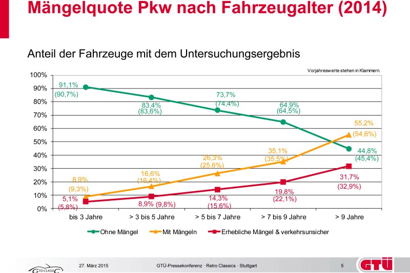 Lediglich leichte Verschiebungen innerhalb der Mängelgruppen „geringe Mängel“ und „erhebliche Mängel“ wurden registriert. Geringe Mängel nahmen mit 13,8 Prozent (Vorjahr: 16,2) leicht ab, allerdings stieg im Gegenzug die Zahl der Fahrzeuge mit erheblichen Mängel auf 22 Prozent (Vorjahr: 21,1)